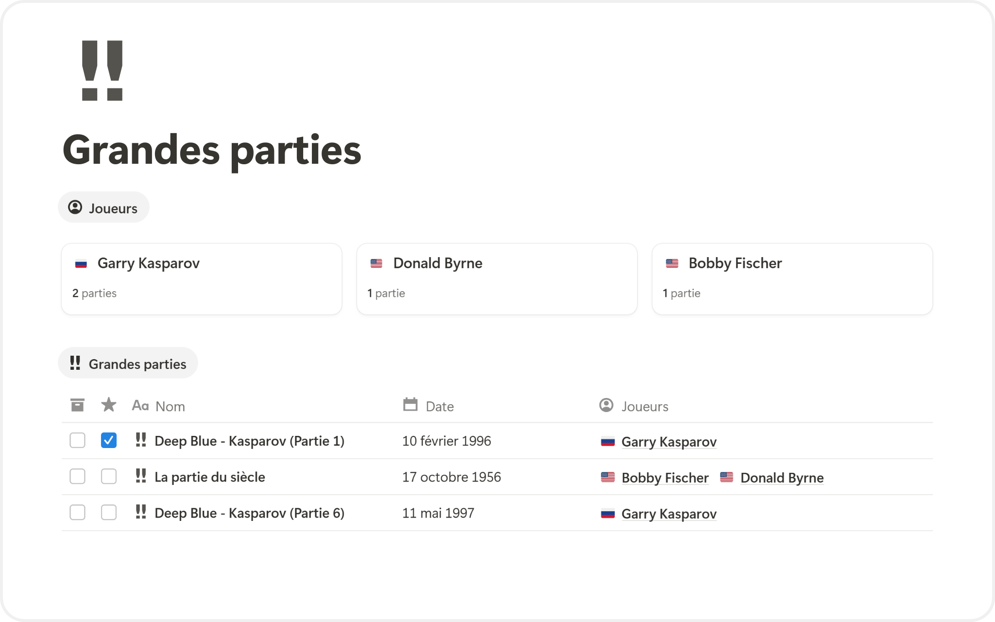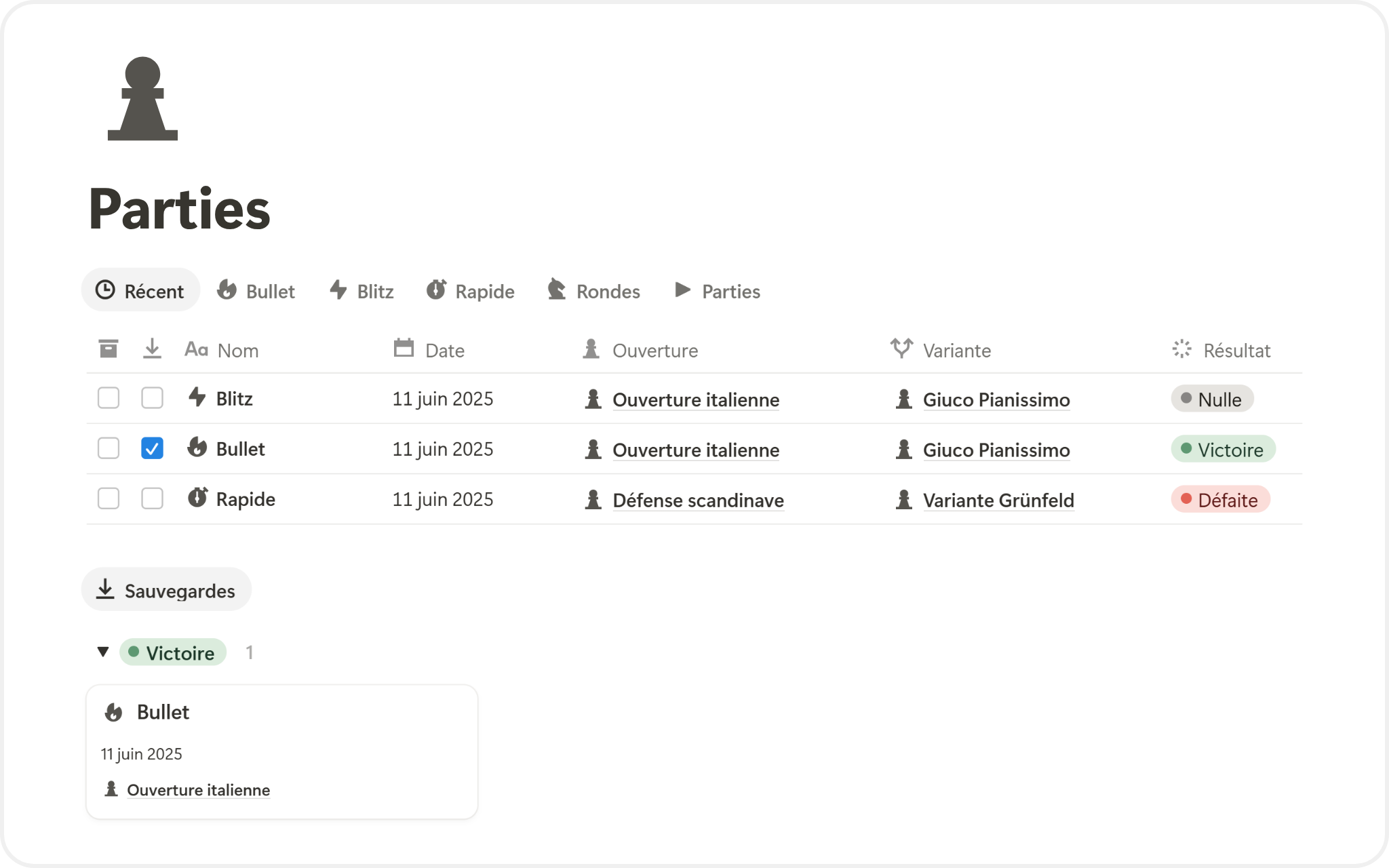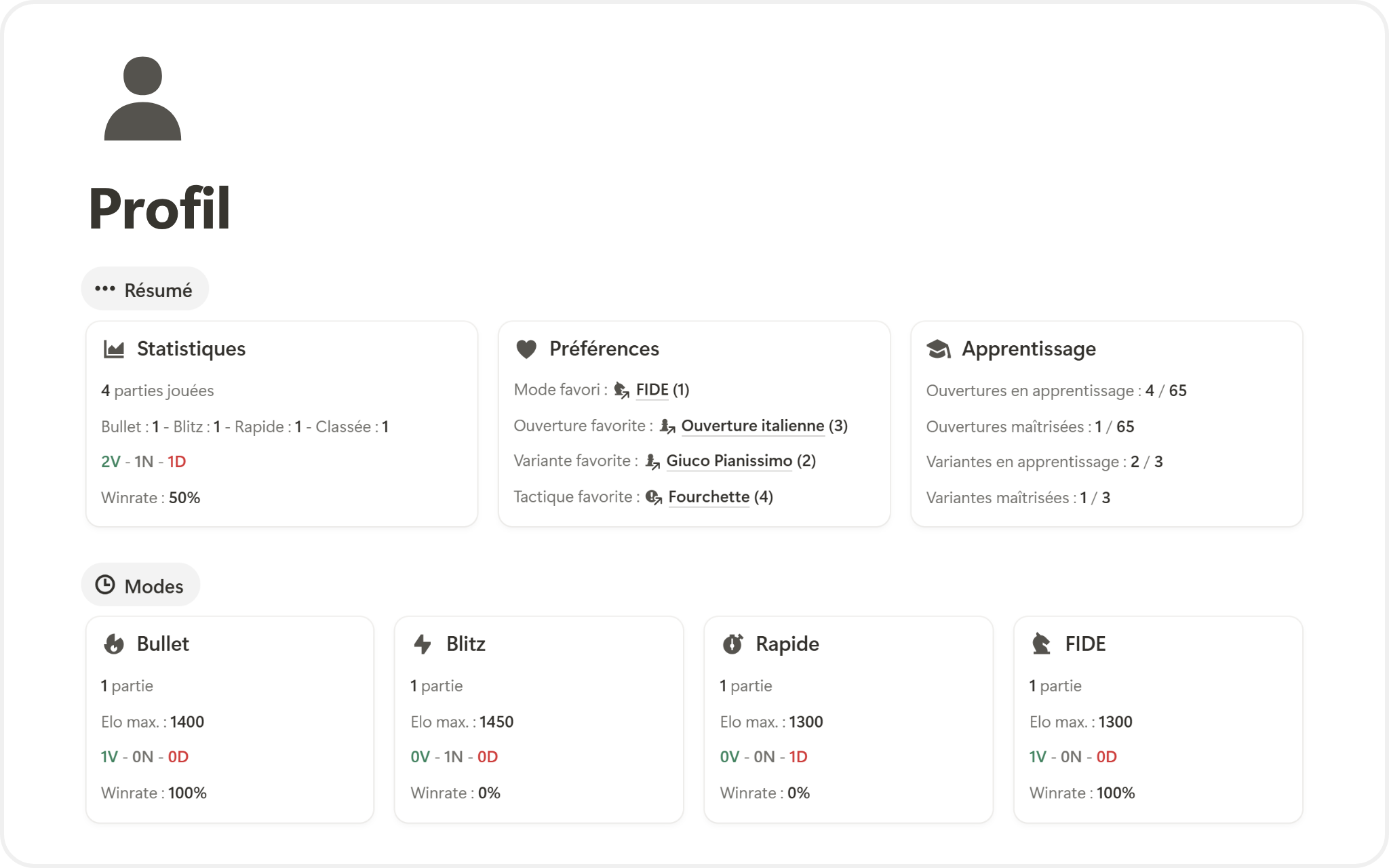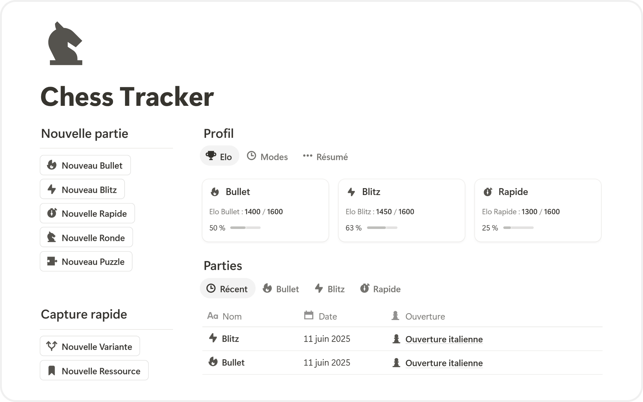 Gardez un historique clair de toutes vos performances. Consignez chaque partie selon son format, analysez vos erreurs et suivez vos résultats.