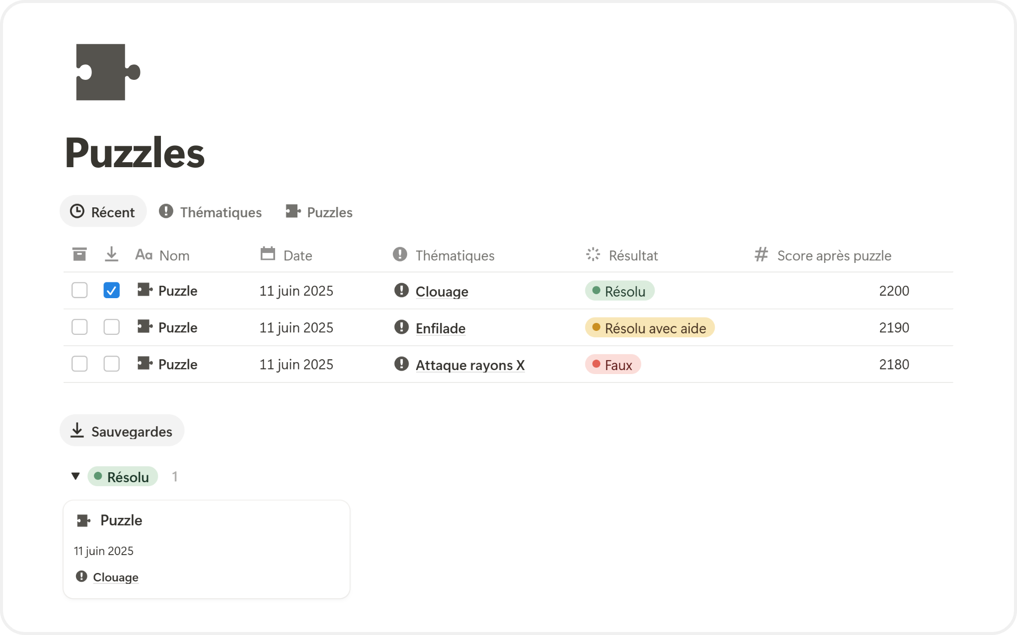 Centralisez vos puzzles favoris, classez-les par thème et suivez vos progrès : l’outil parfait pour tester votre intuition.