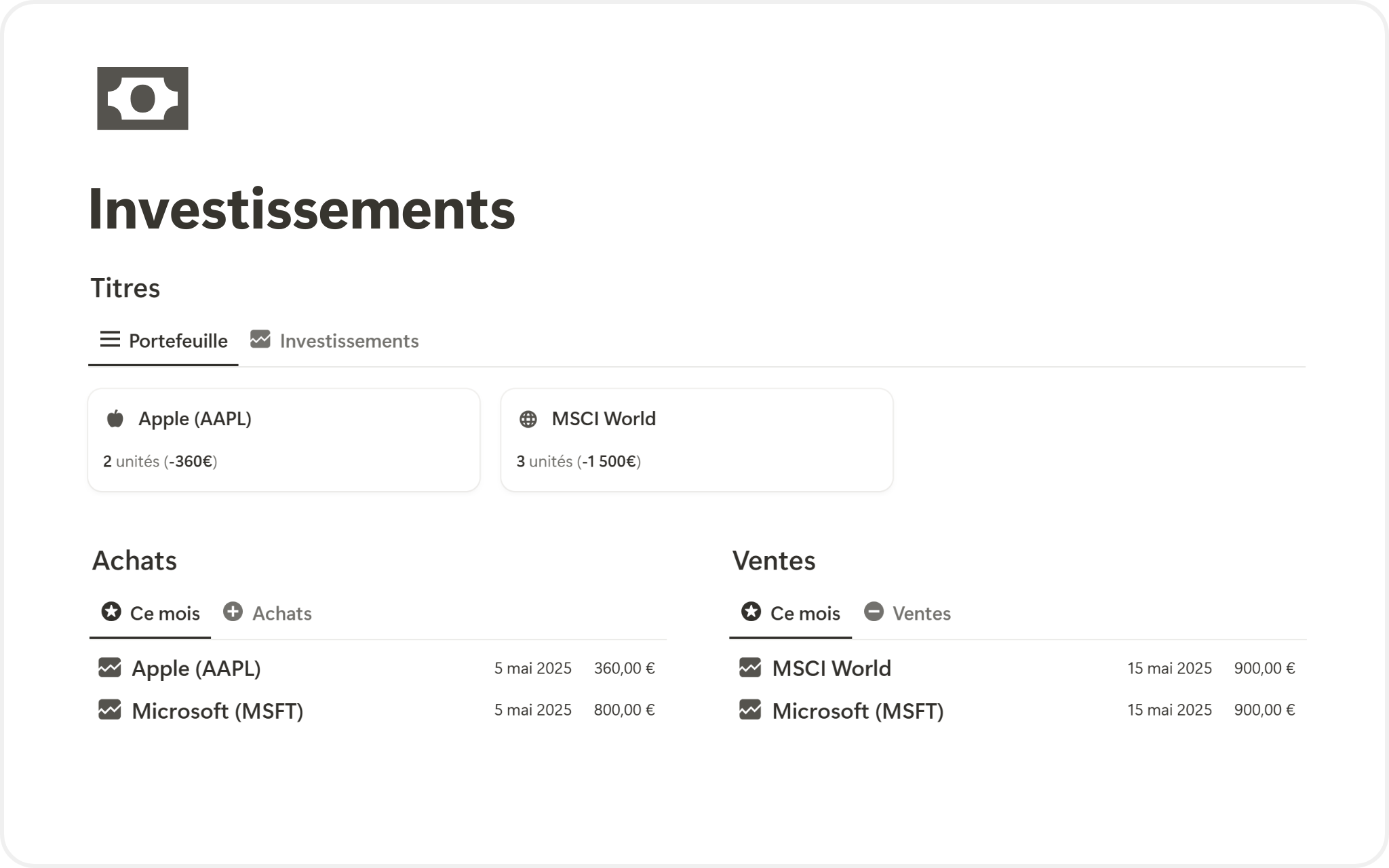 Finance Tracker vous aide à reprendre le contrôle de vos finances personnelles et à générer des revenus passifs en suivant vos investissements.