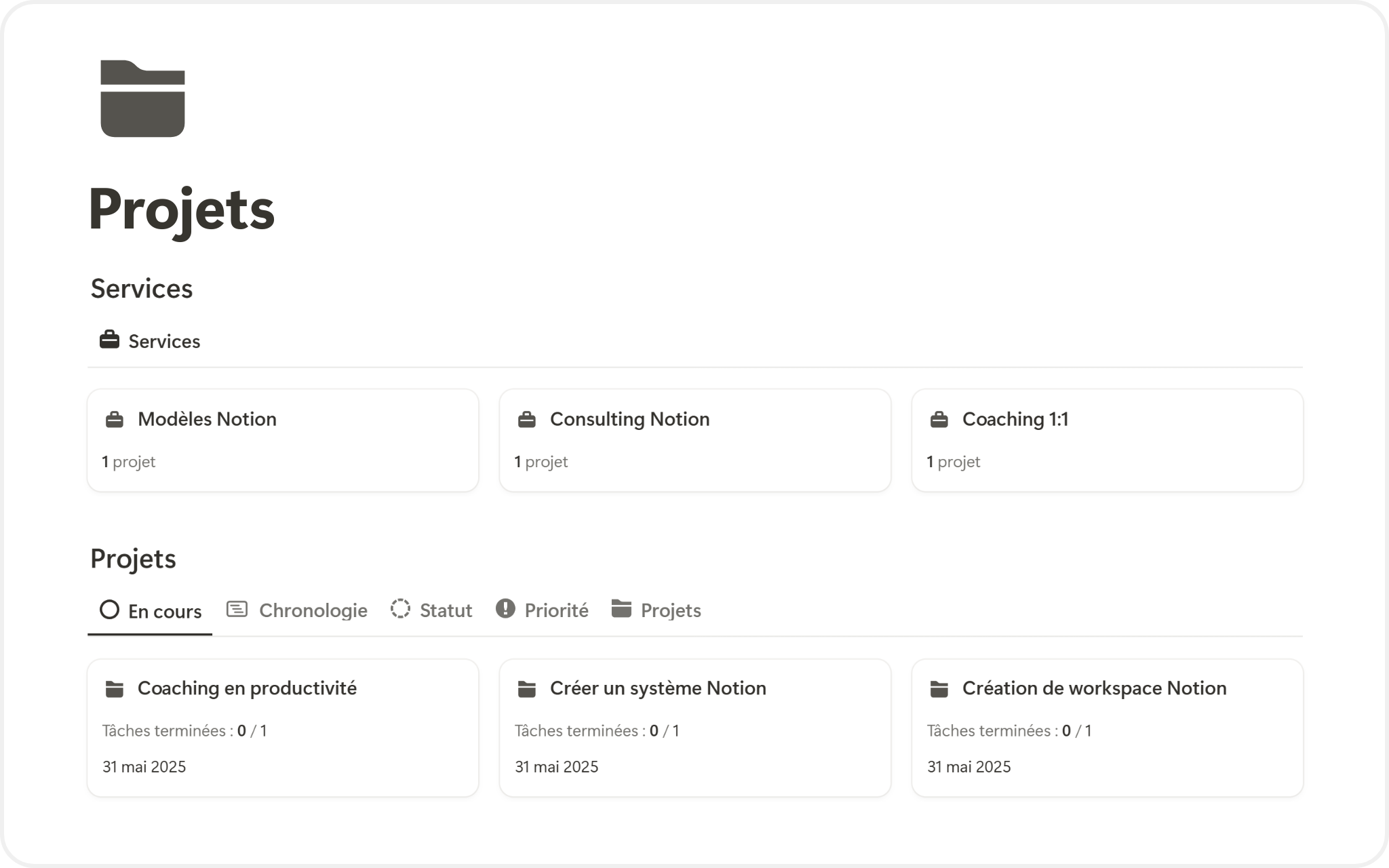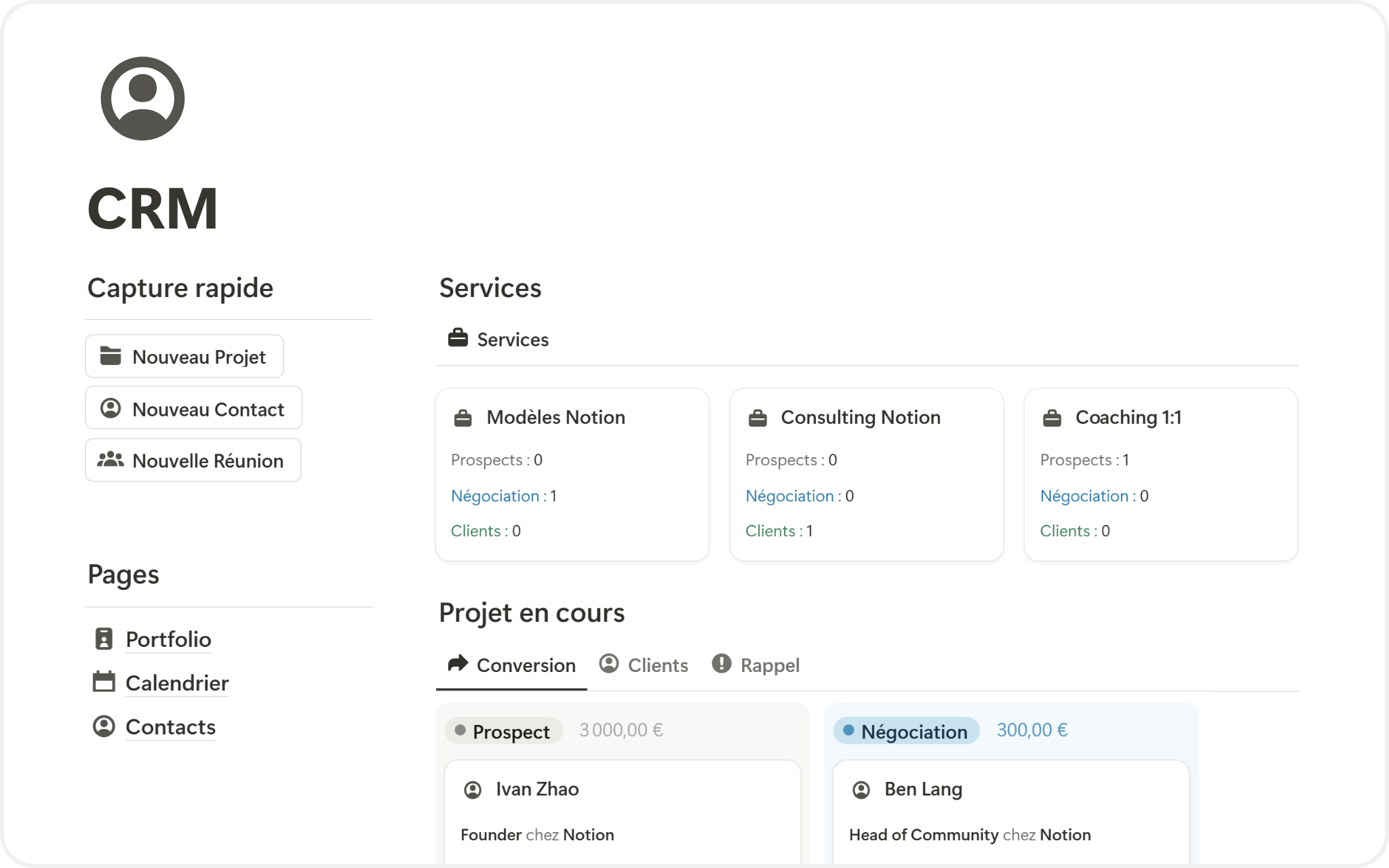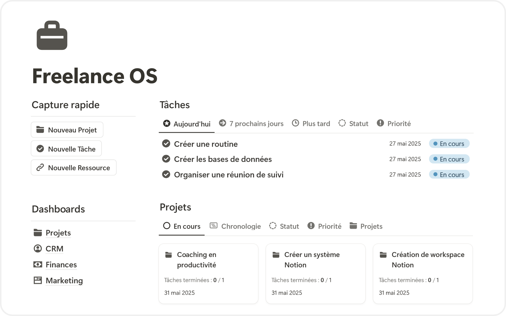 Freelance OS contient toutes les fonctionnalités nécessaires au travail freelance, le tout facilement accessible depuis un seul endroit sur Notion.