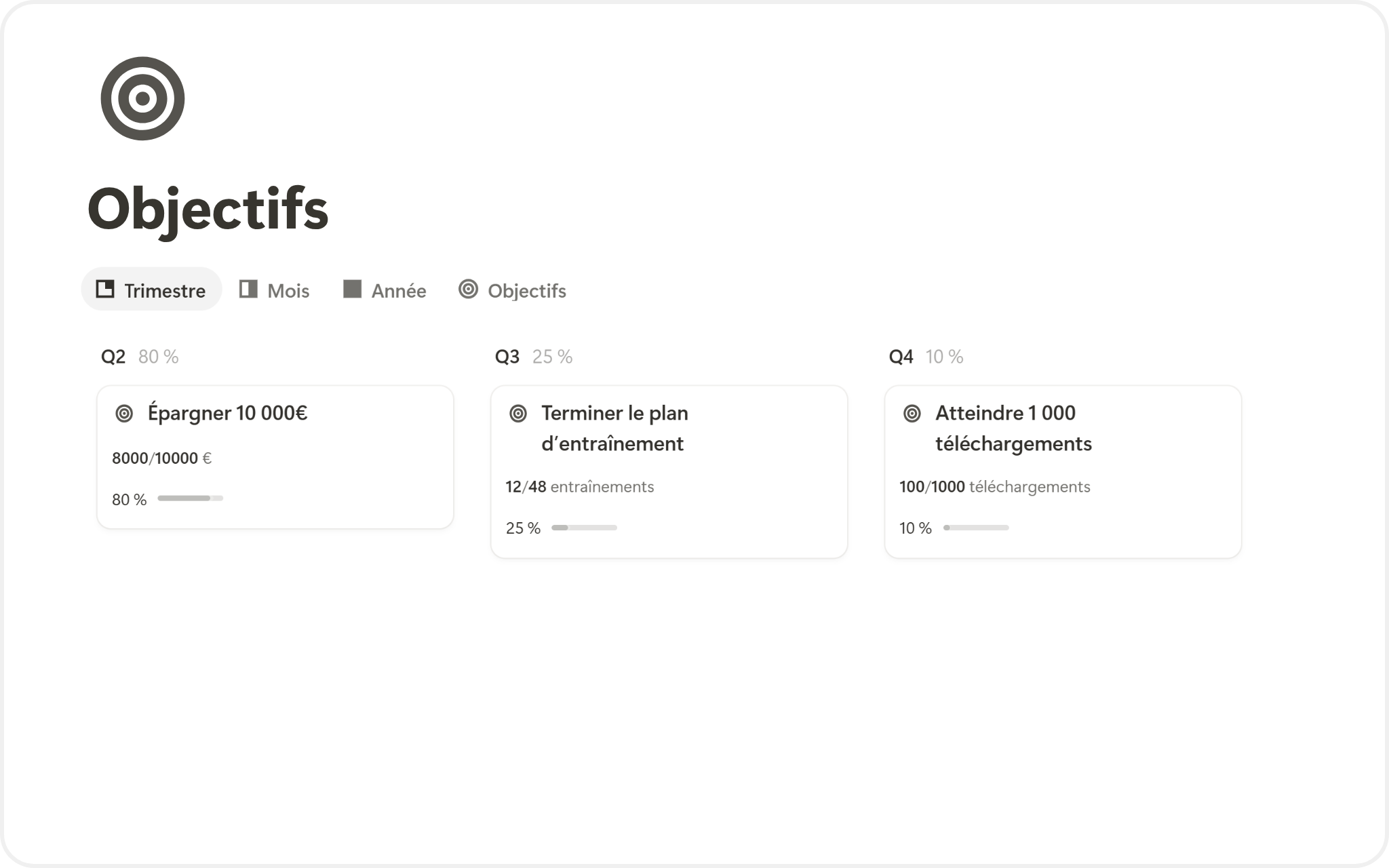 Consultez votre tableau de bord pour suivre l'intégralité de vos objectifs.