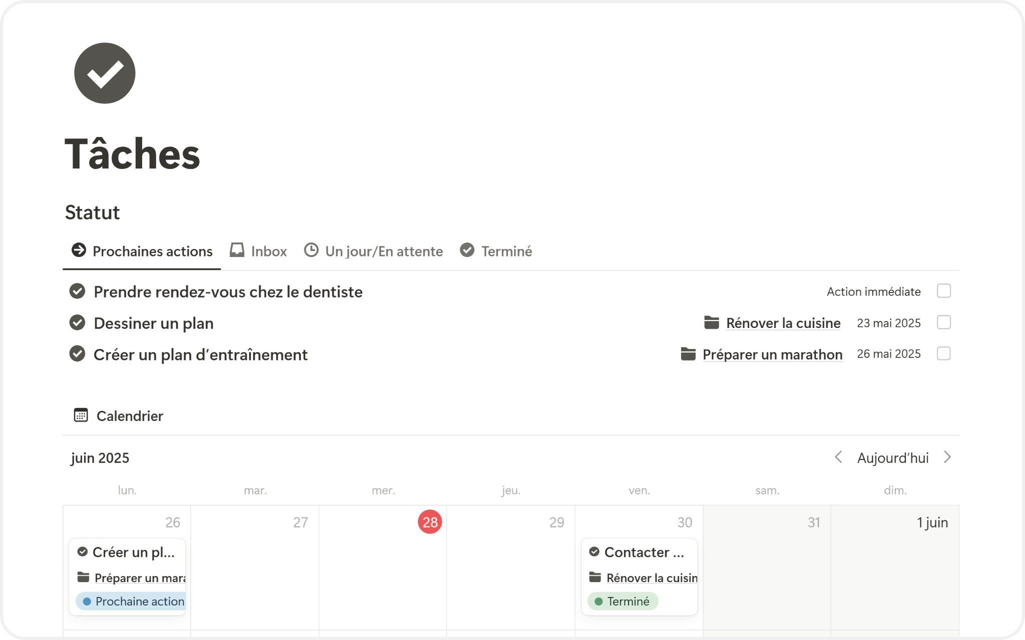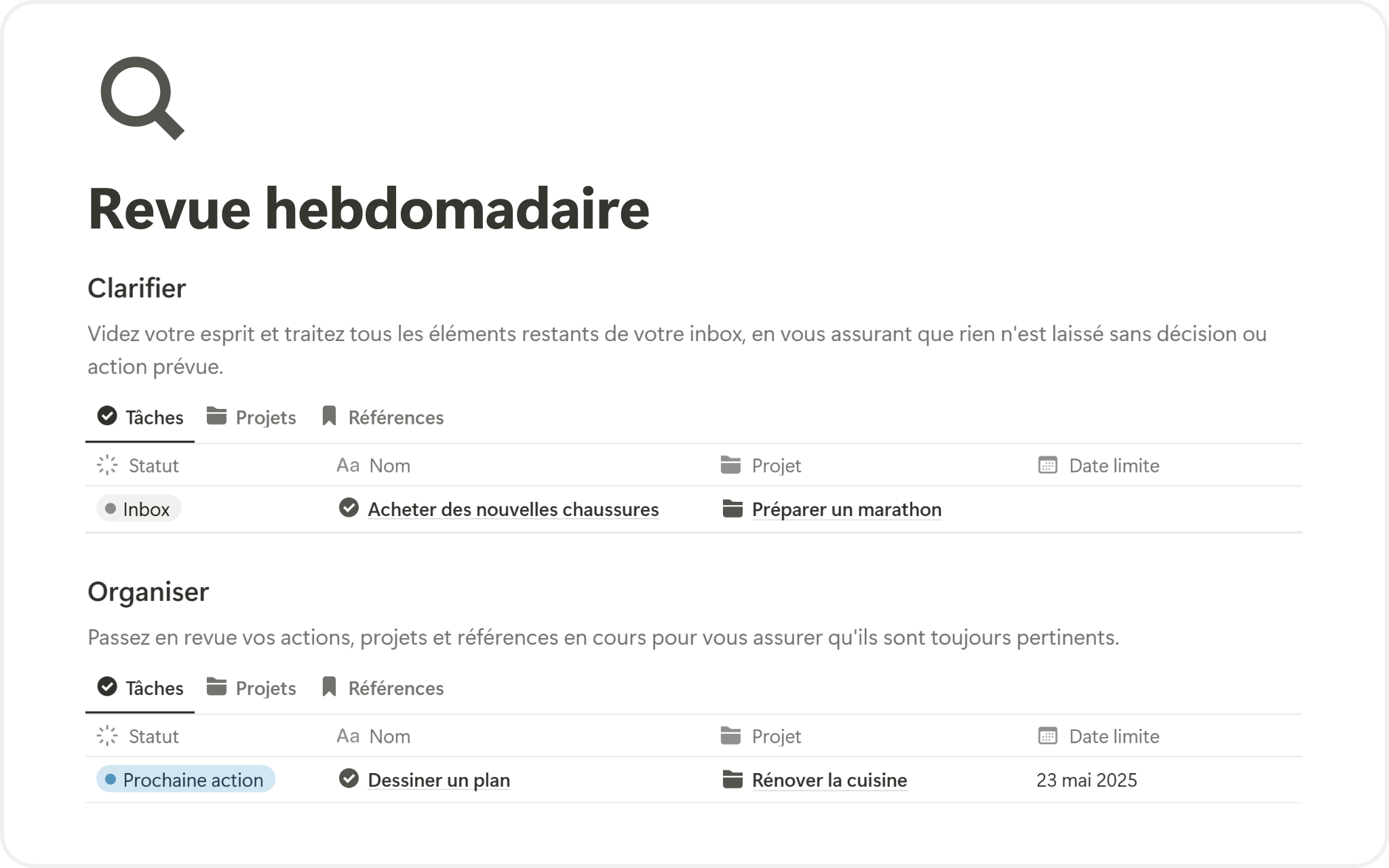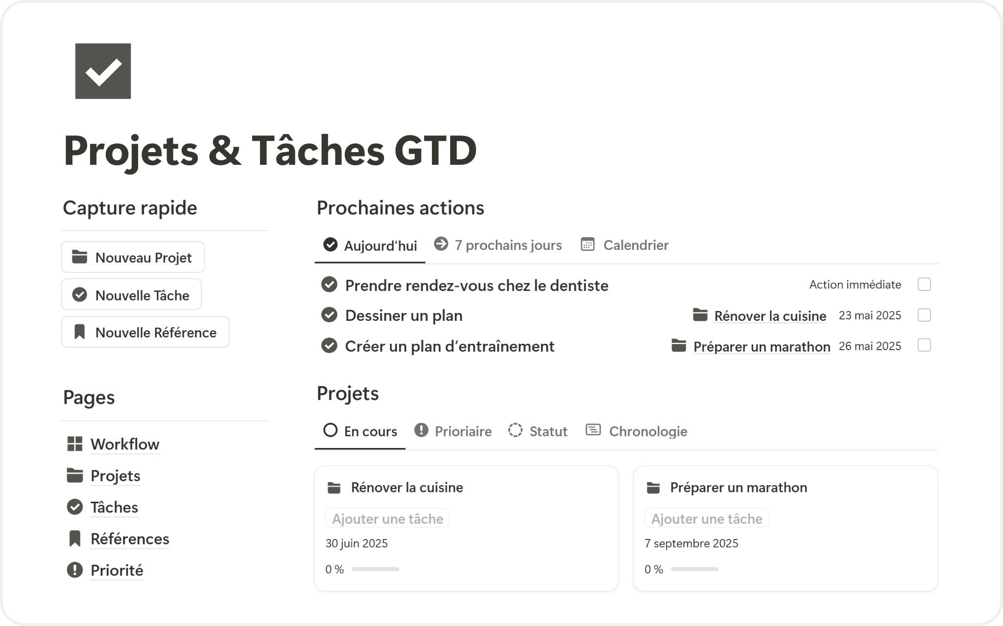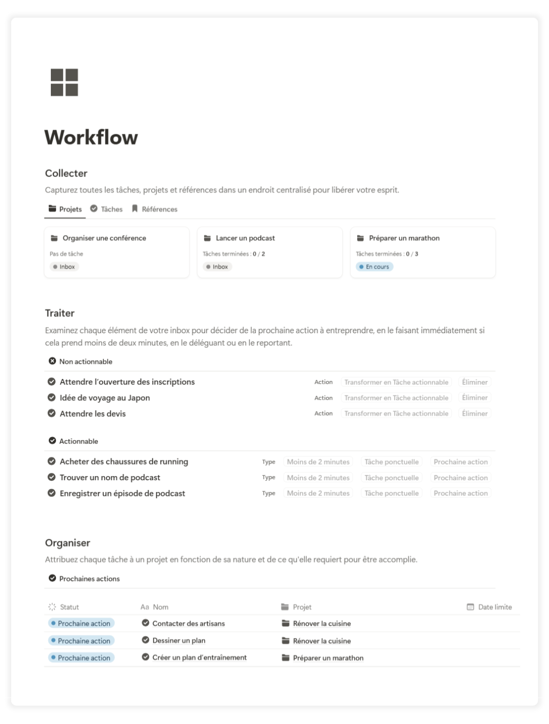 Ce modèle est conçu pour parfaitement exploiter la méthode Getting Things Done® de David Allen. Il vous aidera à vous organiser, prioriser vos tâches et vous concentrer sur l'essentiel.