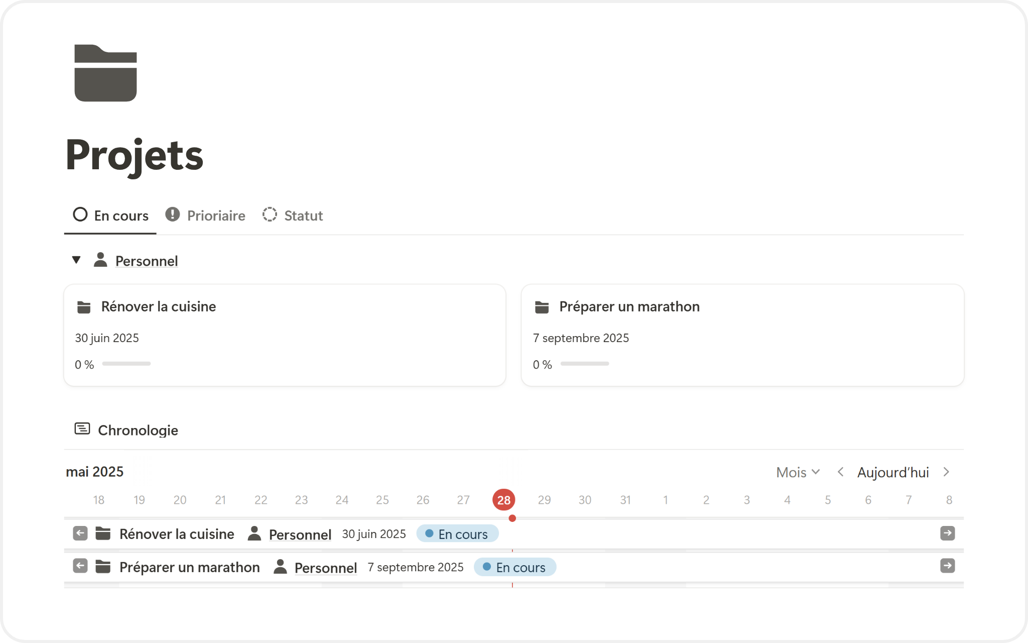 Retrouvez l'ensemble de vos tâches, projets et ressources sur le tableau de bord, spécialement imaginé pour faciliter l'accomplissement de vos objectifs personnels et professionnels.