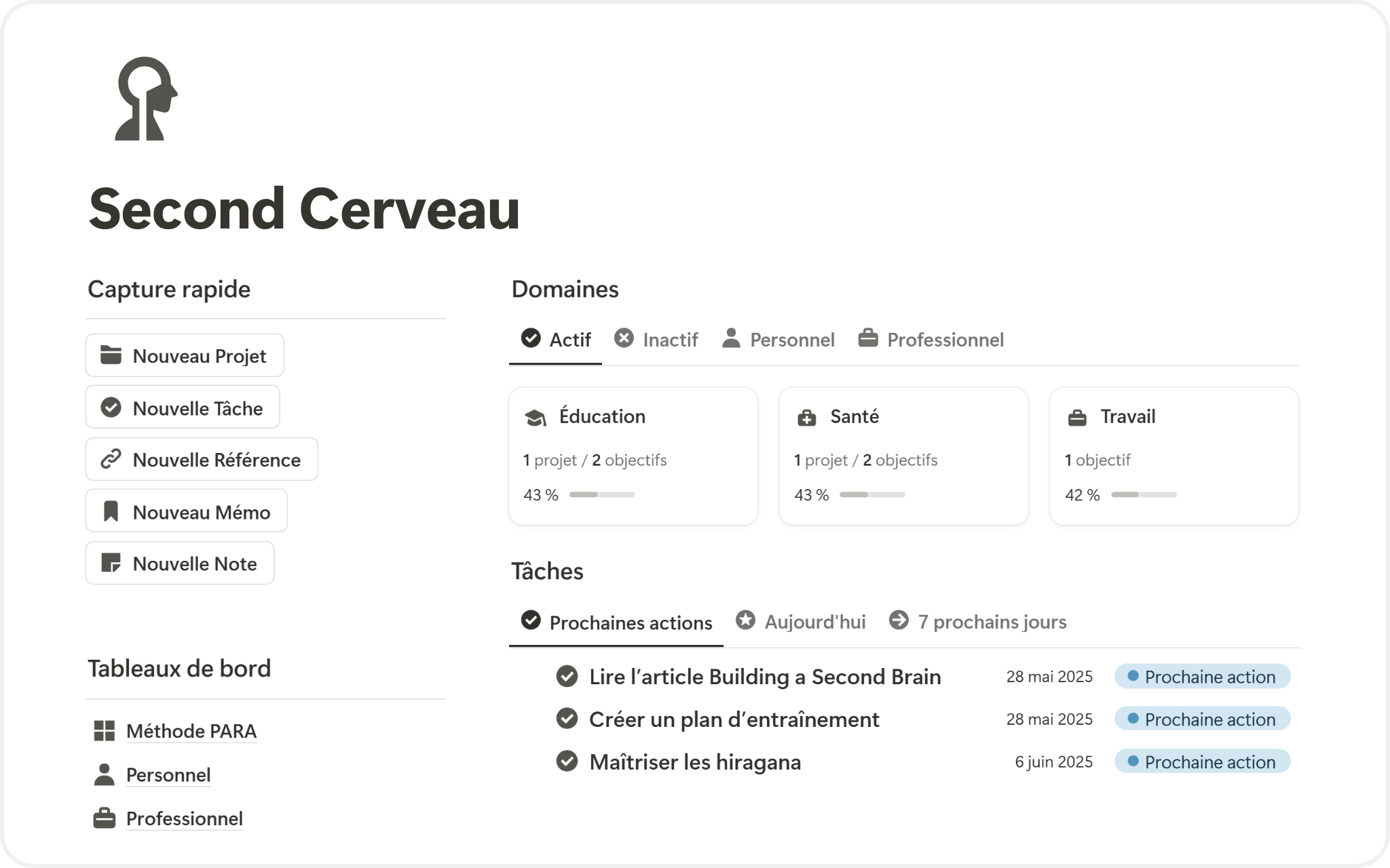 Second Cerveau vous aide à centraliser vos projets, tâches, références et notes en un seul endroit pour faciliter la réalisation de vos objectifs personnels et professionnels.