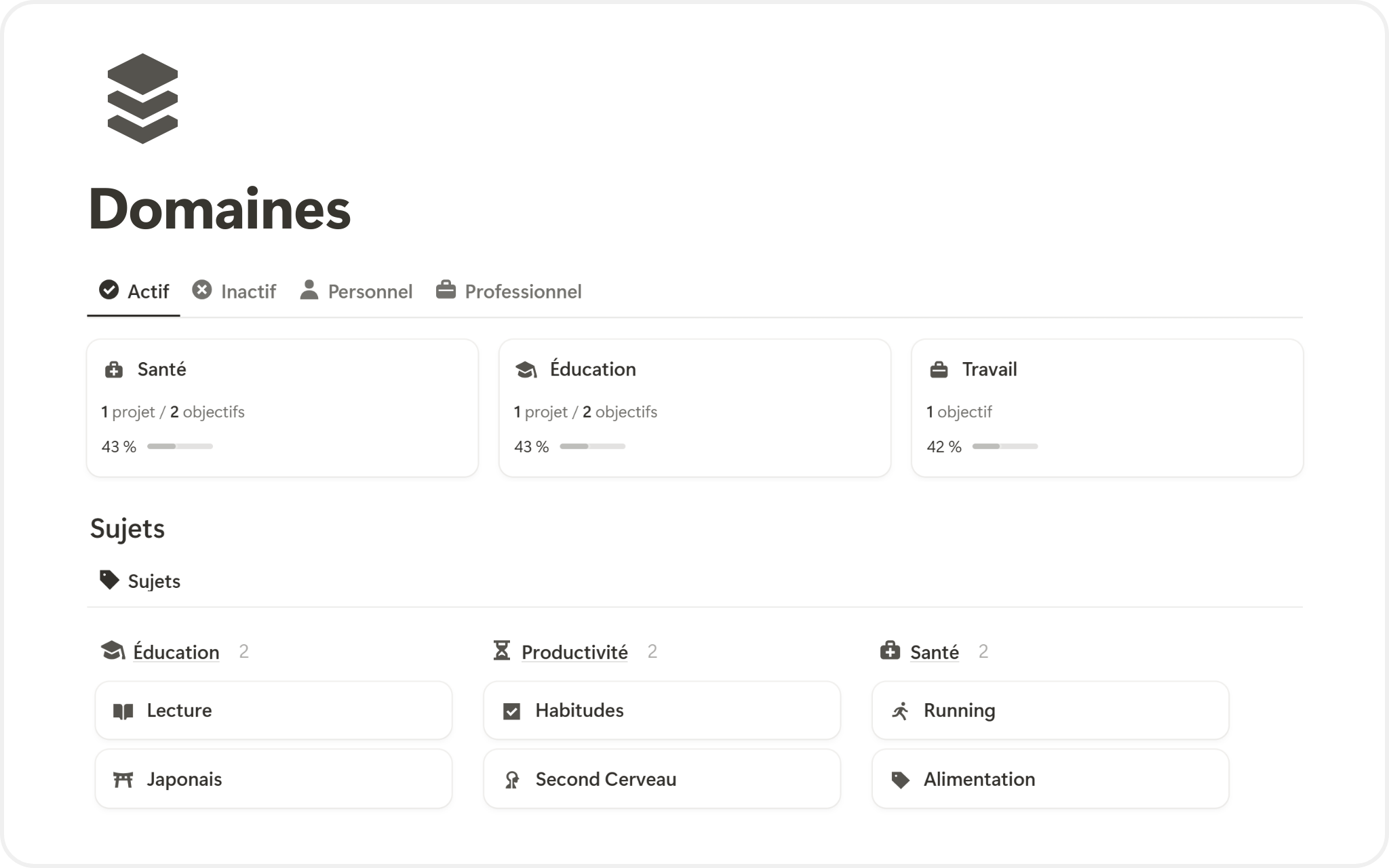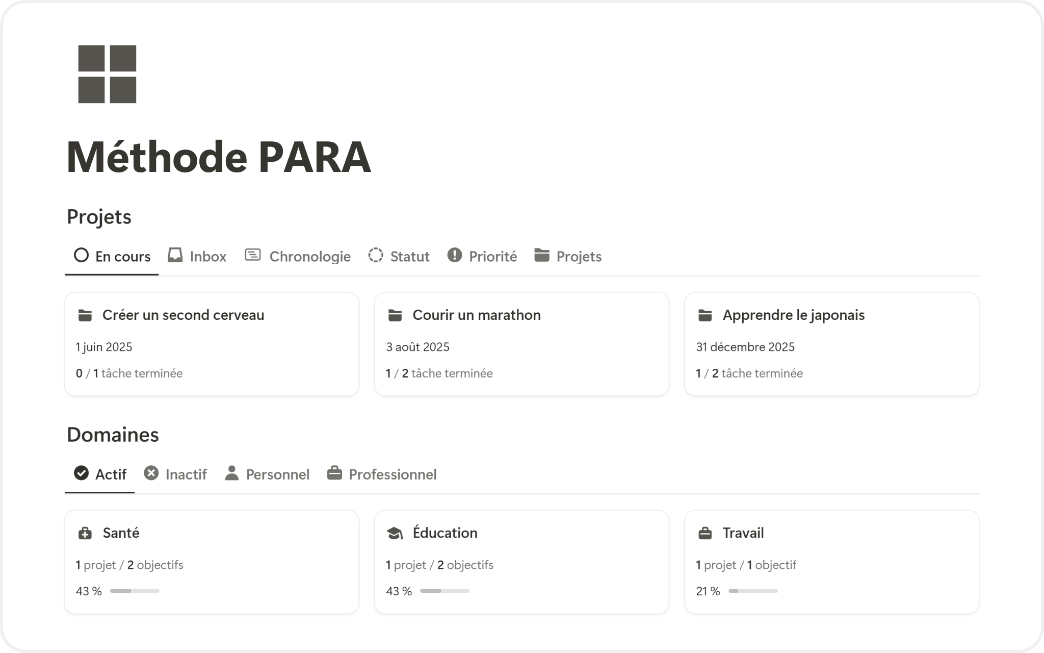 Ce modèle est fait pour tous ceux qui aspirent à une meilleure maîtrise de leur temps et plus d'efficacité au quotidien, grâce à la méthode d'organisation PARA de Tiago Forte.