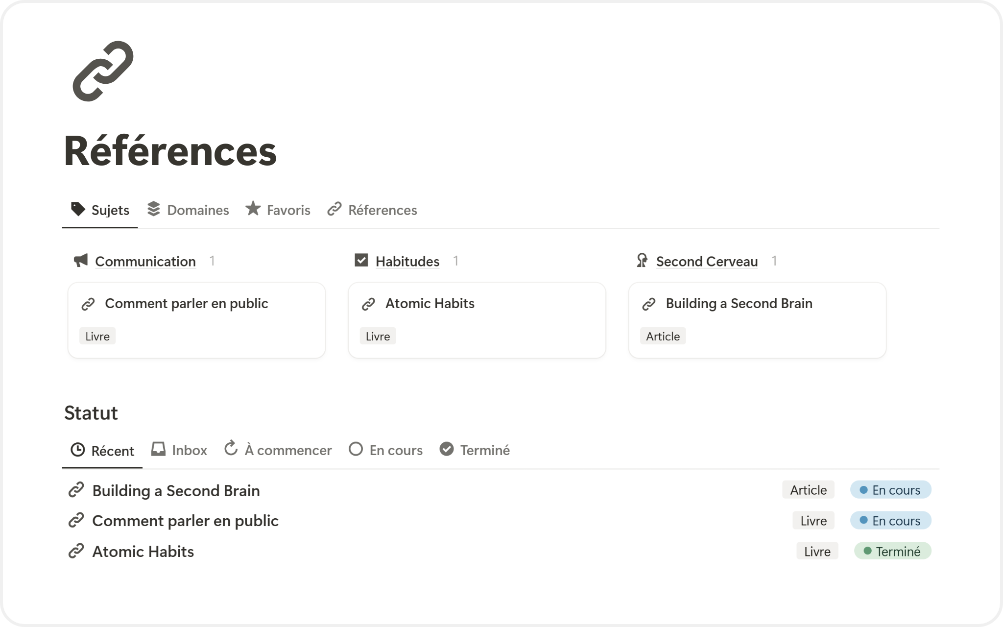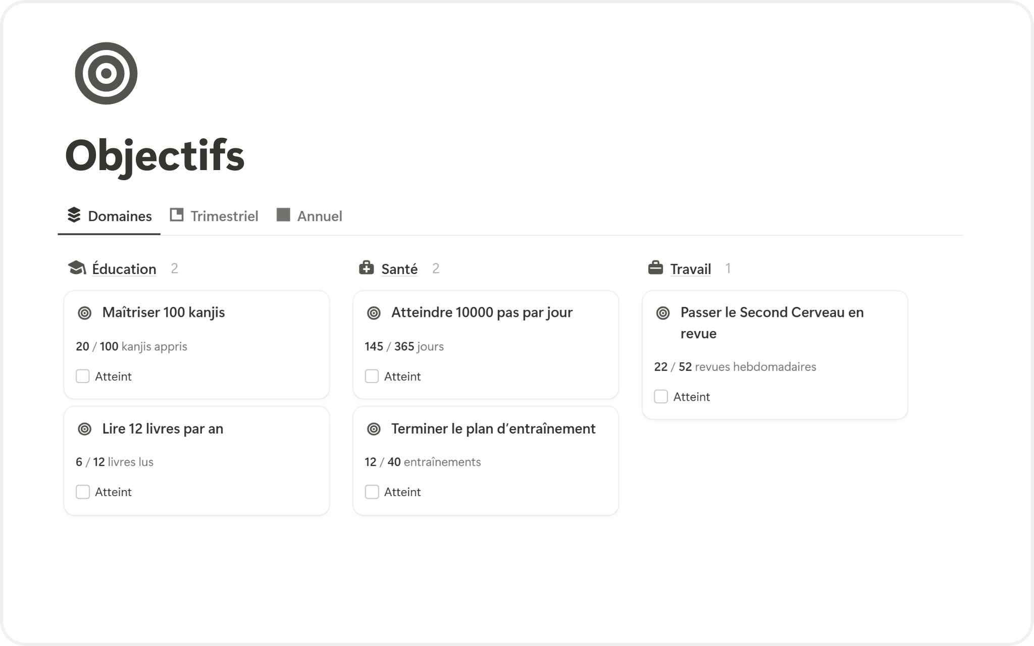 Économisez du temps et de l'énergie en centralisant vos objectifs, projets, références et notes en un seul endroit. Effectuez des revues hebdomadaires pour garder votre Second Cerveau clair et organisé.